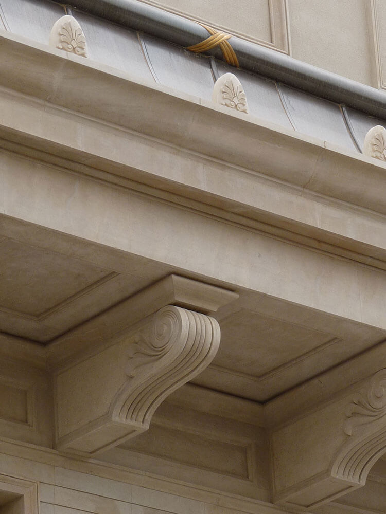 The main architectural features are in Egyptian limestone with carved pilasters, capitals, corbels and the walls in stucco render. The roof is made from copper with brass ornaments. The interiors of the residence were designed by the interior decorator, Alidad.